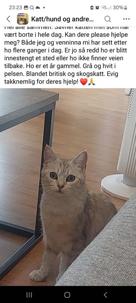 Vakre pusen min på et år har vært ute i hele dag uten og komme hjem. Jeg blir Evig takknemlig om dere kan se i garasjen el andre steder hvor ho kan ha blitt innestengt.