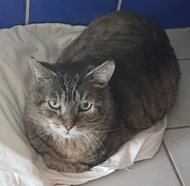 Han er stripete på hodet og nakken og benen, men ikke egentlig på kroppen. Han er grå runt mun og haken, grunnet høy alder. Han har også et sår på poten på høyre bakben. Vi holdt på med daglig behandling av såret. Han har også måttet fjerne en klo på høyre fremben. Vi vet ikke eksakt hvor gammel han er, da han var hemløs og kom til oss i 2014, men han er riktig gammel og det haster å finne han.