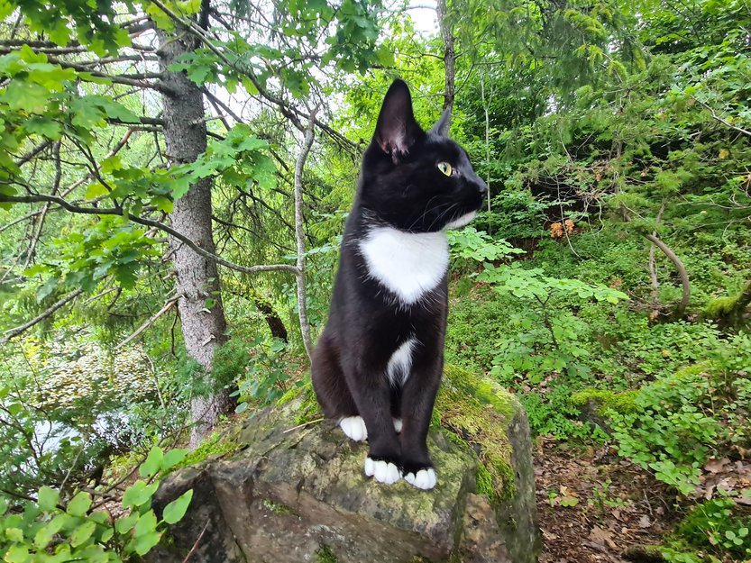 Hun er 3 år og ikke særlig oppsøkende, men kosete om hun stoler på deg. Hun reagerer på Freyja med islandsk uttale eller type høy tone "kysse lyd" Slags muselyd kan du si. Hun har hvite poter, hvit prestekrage og hvit haletupp.