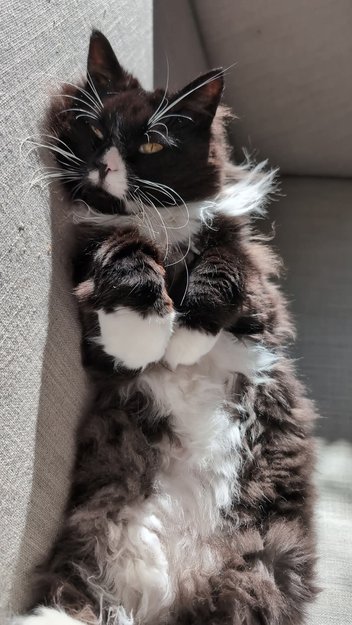 11 år gammel svart katt med hvite flekker i ansiktet, hvit mage og poter. Litt korte bein. Sky og skvetten.