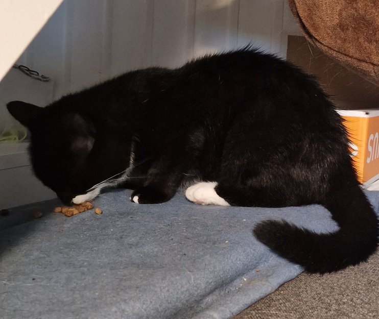 Svart med hvite flekker på tupper på lab venstre side nese og under hodet