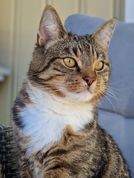 "Vaskebjørn-hale", lys og feminin mjauing, hvite poter, hvitt bryst og hvit mage. I dagslys kan han ha ganske "psyko", store øyne. Kosete, men skvetten.