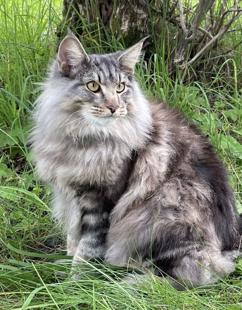Ung, slank hannkatt med lang buskete hale. Lyder navnet sitt. Litt skeptisk overfor fremmede.