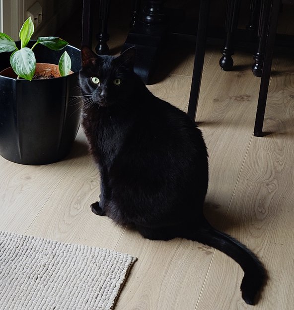 Karakteristisk trekk er løst skinn under magen som disser fram og tilbake når han går. Er nok litt redd og pysete av seg. Ganske stor katt. Mjauer veldig høyt. Katten står registrert på min sønn Aleksander dersom noen skulle lese av chipen.