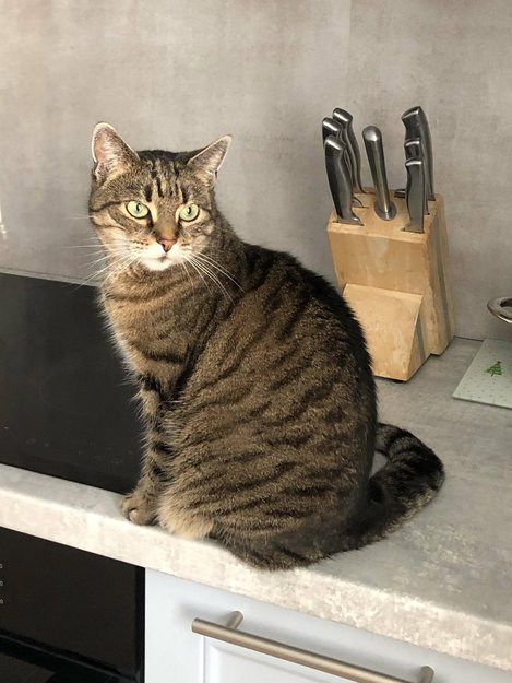 Hun mangler en øvre hjørnetann og har løs hud på magen som henger litt ned. Hun er 12 år gammel. Hun har bodd inne hele tiden. Vi tror hun er veldig redd og kanskje ikke svarer når man roper på henne.