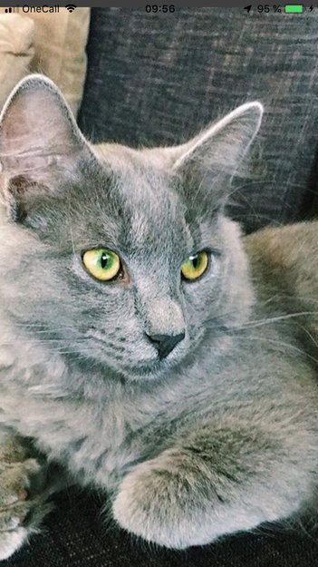Halvt skogkatt, små poter. Liten hvit flekk på brystet. Grønne øyne. Ingen flokete pels.