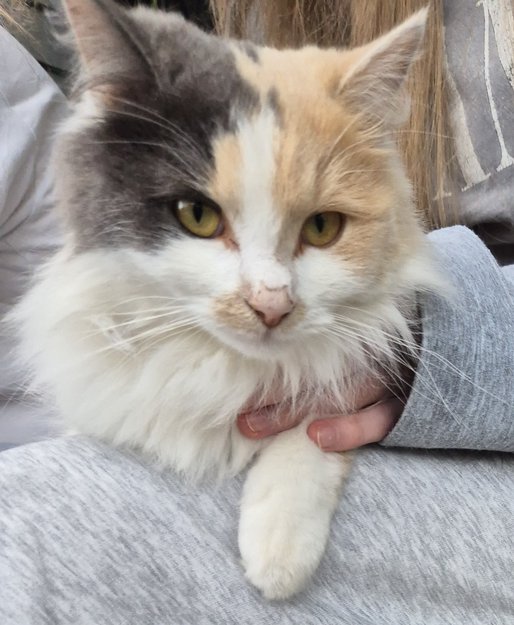 Jeg kom hjem fra handletur rundt 20.00 fredag (25/7) da denne lille pusejenta var i hagen min. Da jeg gikk fra bilen og mot inngangsdøren kom hun mjauende etter. Hun var veldig tørst, sulten og virker veldig, veldig sliten. Hun har stort sett spist og sovet siden jeg fant henne (eller hun fant meg). Det er en veldig liten og tynn katt, kanskje hun er 6-7 måneder, men jeg kan ta feil. Det må jo være noen som savner en så vakker og skjønn pus?