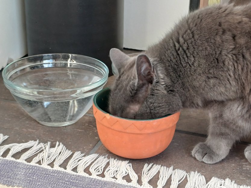 Grå, liten (4-4,5 kg) hunnkatt med gule øyne, mellomlang pels. Engstelig, men nysgjerrig katt, som reagerer på "pss, pss, pss" i rett humør. Glad i kattegodt, ellers uinteressert i mat.