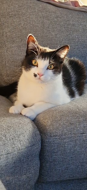 Hvit og svart hannkatt på 1 år.