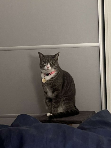 Hun er grå korthåret med sorte/hvite striper, hvit flekk under halsen, rosa nese, grønne øyne og hadde på seg rosa halsbånd da hun forsvant.
