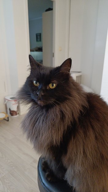 Har svart langhåret pels, med grå undertoner. Hvite hår i ørene. Har også en del hvite hår her og der pga alder. Er barbert på høyre side av brystkasse.