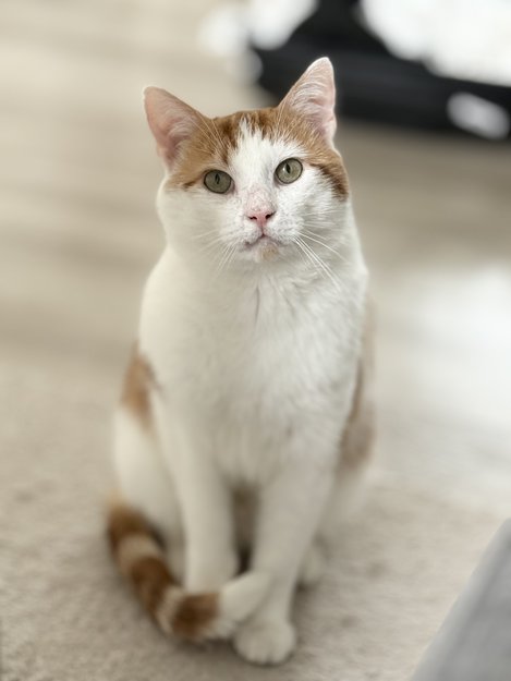 Hvit katt med oransje felt på hodet, ryggen og hale. Har mørkere oransje striper i pelsen (tigerstriper), særlig synlig på sidene av kroppen og halen. Runde, grønne øyne.