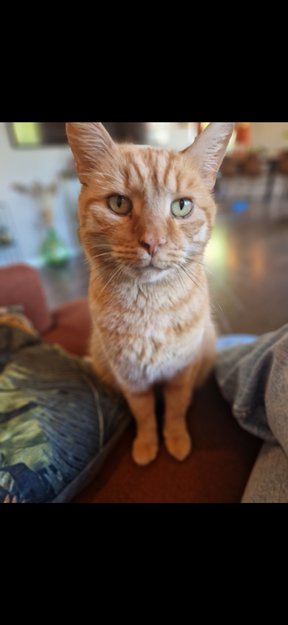 Han er en voksen, oransje hannkatt, kastrert og chippet.