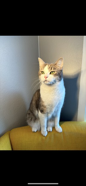 Grønne øyne og striper på halen. Han eg glad i å være ute. Noen få ganger har han vært borte hele natten, men kommer alltid hjem dagen etter. Han liker å gjemme seg i garasjer og lignene