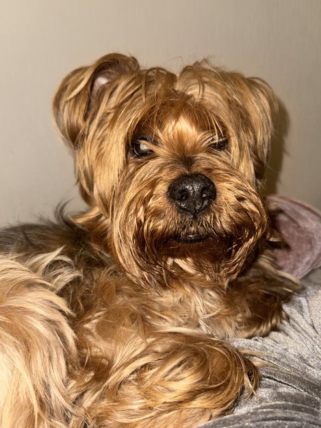 Gult halsbånd med bier på hvor det står navnet hans»Anton» og mitt telefonnummer 90408943. Han er snill og god gutt. Mistet en del tenner og har grå stær på begge øyne. Pappa og Anton befinner seg langs kynndalsvegen 2412