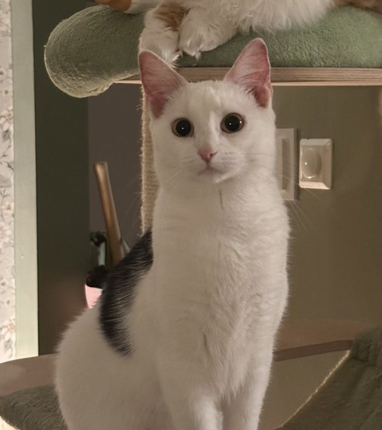 Helt hvit men svart hale og svarte flekker på rygg. Hun er ca 3 kg, liten med små poter. Søtt fjes og veldig snill.