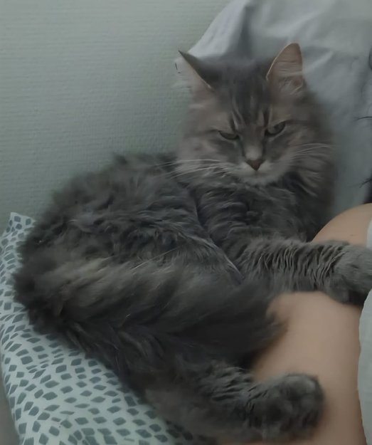Katten er ikke lubben. Fluffy. Grå. Redd for fremmede.
