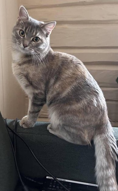 Sølvgrå pels med innslag av brunt og hvitt. Hvit på brystet. Tynn. Til vanlig veldig nysgjerrig og kosete. 9 måneder gammel.