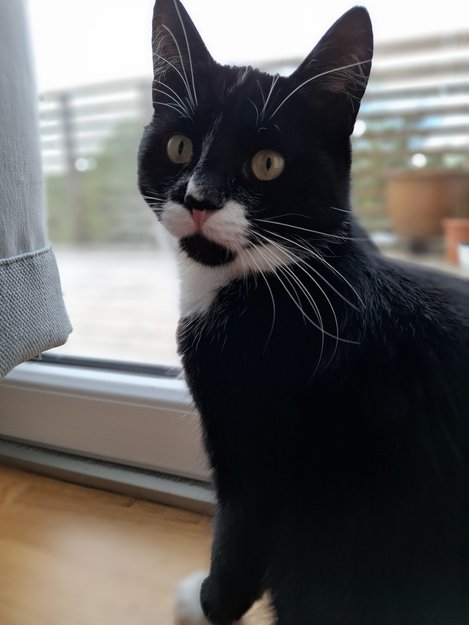 En ung, leken svart/hvitt hankatt med hvitt stripe på nesen. Frisk og rask, elsker å fange mus og fluer. Bruker å holde seg i nærheten av huset, men liker samtidig å utforske nye plasser, vant med å reise.