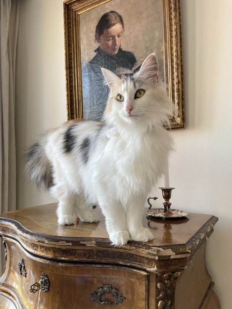 Nesten helt hvit, men med duse tricolorfarger i ansiktet og langs ryggen, og mørk hale. Langhåret. Generelt imøtekommende katt.