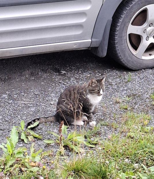 Helt klart en katt som hører til et sted, men for øyeblikket henger den rundt her. Den er overhodet ikke interessert i å la meg sjekke kjønn, så det vet jeg ingenting om. Fremstår som en ganske ung katt