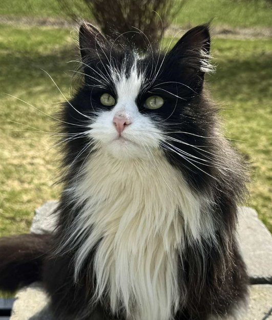 Tofarget, svart og hvit. Lang pels. Svart på kroppen. Hvit på snute, bryst, mage, poter og på haletippen. Chippet. Normalt kontaktsøkende og kosete.