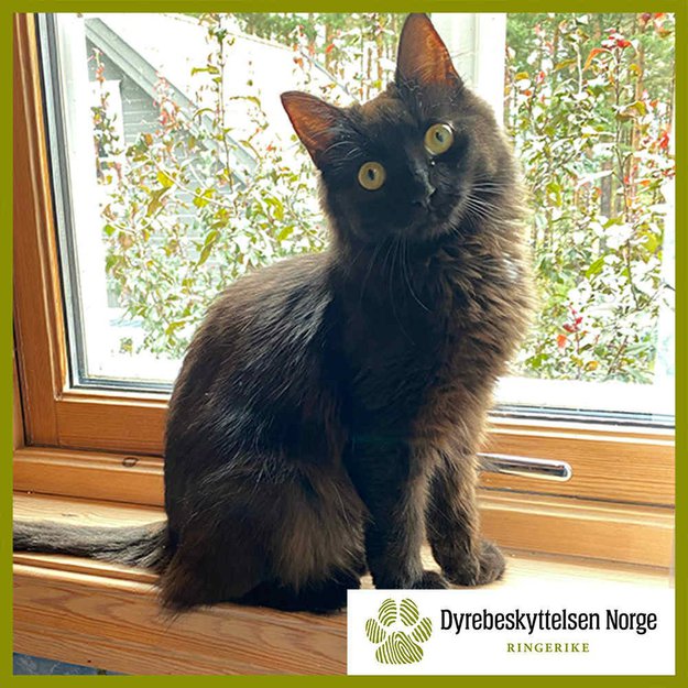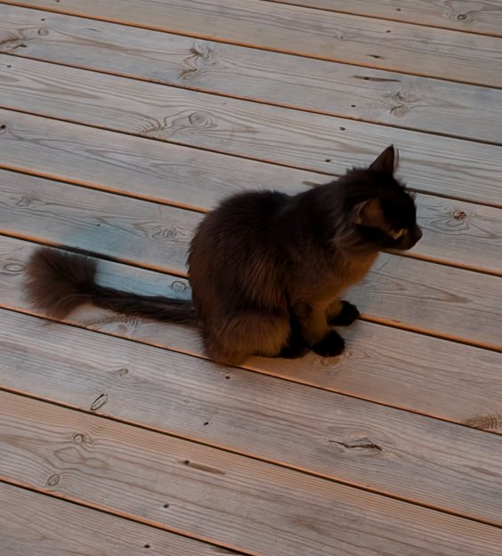 Ung frøken som har oppholdt seg rundt huset vårt i flere dager. Veldig kosete og mjauer mye. Virker litt tynn, men ellers fin i pelsen, utenom halen som har mindre pels frem til ca 7 cm fra haletippen.