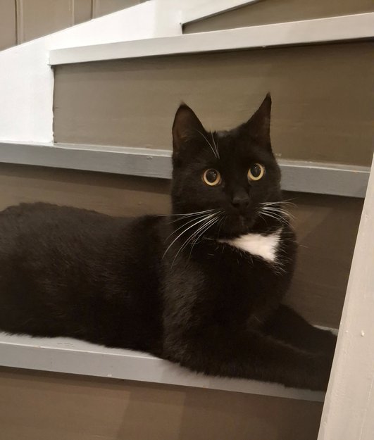 Han er svart med hvit på halsen, hvit som en strek under munnen, hvite bakpoter og litt mindre hvitt foran poter.