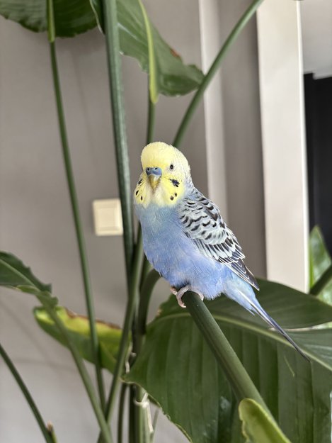 Denne undulaten satt og kvitret i ledningsnettet i gata. Jeg klarte å lokke den til meg, og den fløy ned å landet på hode mitt. Fikk den enkelt med meg inn. Veldig tam, sjarmerende og tillitsfull.
