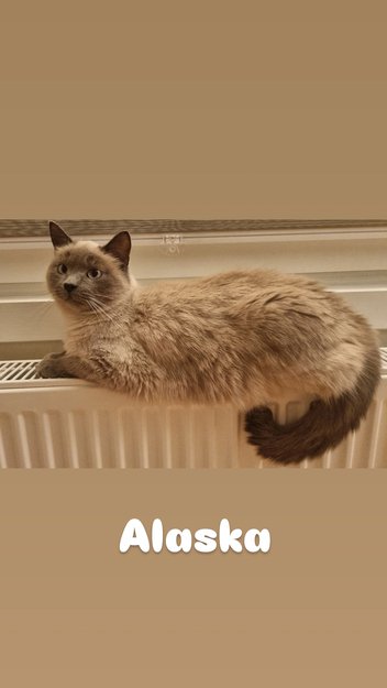 Alaska er creme og beige pointed med turkis øyne. Hun har halvlang pels. Hun er en liten katt på ca 3,5 kg. Hun er kærvenlig og liker at bli klappet på hodet. Hun er følsom på ryggen så liker ikke at bli klappet på den like mye. Man kan lett plukke opp hen men hun liker det ikke for lenge.