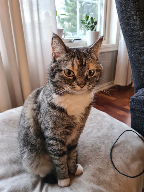 Frida er 7 år, men ganske liten. Hun er grå med svarte striper med hvitt på brystet og på føttene.
