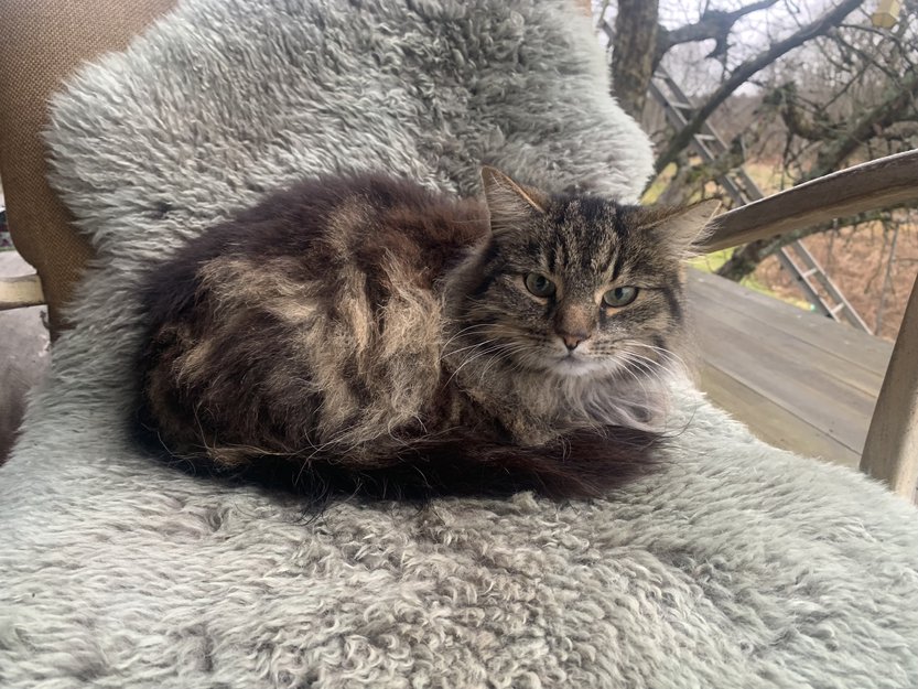 Liten hunnkatt på ca 3,5kg. Blandingskatt, halvt norsk skogkatt. Lettskremt og sky, men et veldig rolig lynne.