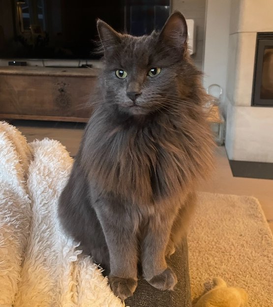 Grønne øyne og grå lang pels. Veldig sosial og glad i kos. Legger seg gjerne på rygg når han får kos på magen.