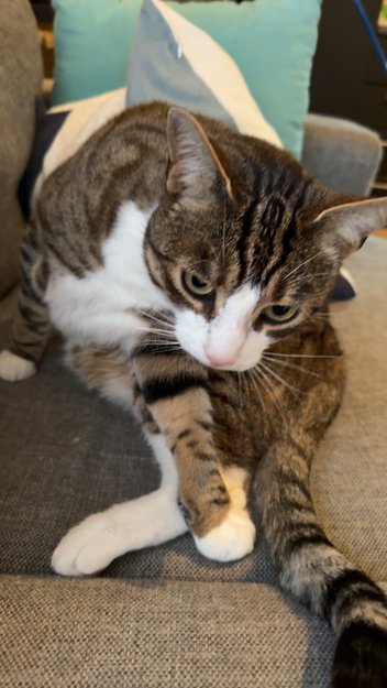 Spraglete med hvit nese og nedover brystet, og hvite poter.