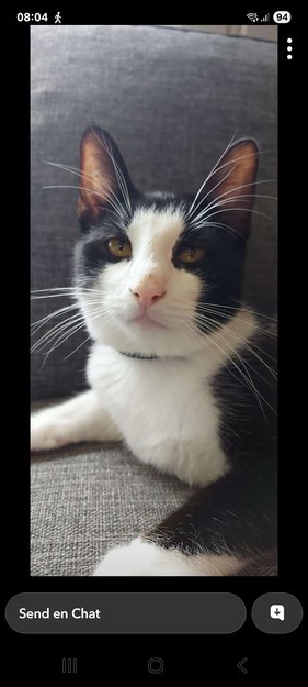 Han er tynn med lang svart hale. Mjauer som en kattunge da han er bare 1 år. Har svart refleksband på seg om ikke han har mistet det,han er chippet.