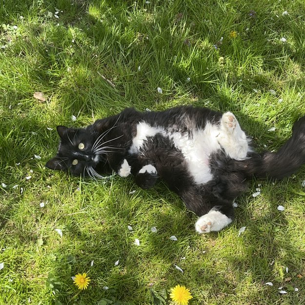 ID chippet med tatovering i ørene. 2 år gammel. Ganske liten. Langhåret, men kortere pels på sommeren. Hvite labber og haletipp. Hvit på brystet og magen, litt på haka, munnen og nesa. Ellers svart. Runde gule øyne