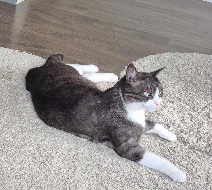 Hvit på halsen og rundt nesen. Hvite labber. Den gråsvarte delen er tigerstripet. Gulgrønne øyne. Kjælen, og villig til å bli løftet.