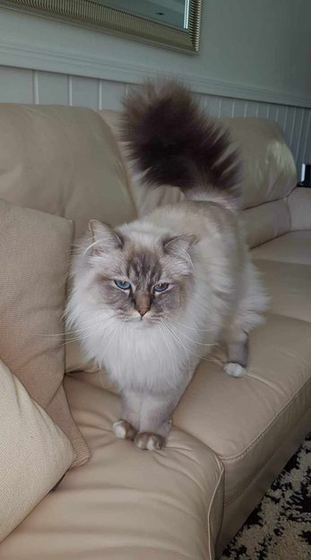 Krøllete pels bak øret, knallblå øynene, var klippet, har grønn flåttbånd på, svarer til navnet Fant, Fantagutta, eller Fant Fant, kosete og sosiale, ganske vokal.