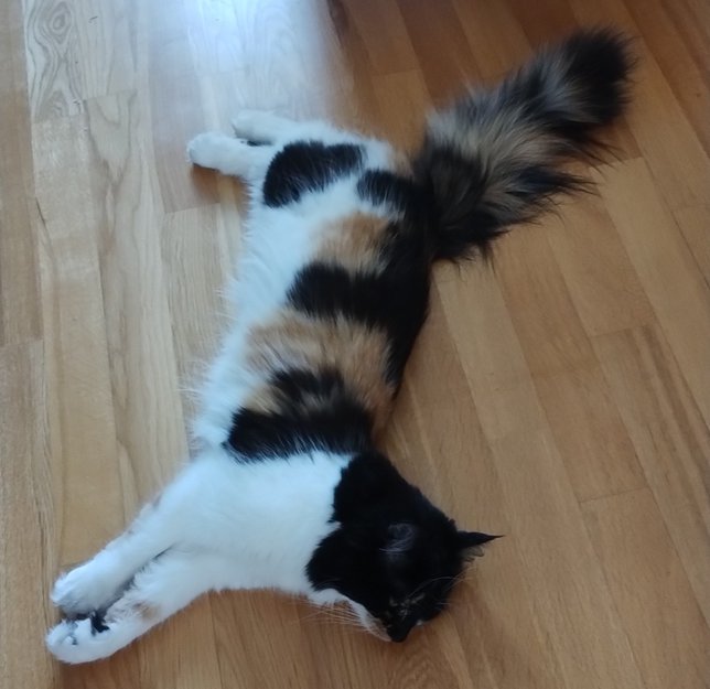 1 år gammel. Skipskatt, 7 tær på frampotene,6 tær på bakpoter. Grønne øyne. Tricolour, hvit mage, sort/oransj hode og rygg. Veier ca 3,5kg. Svært lang hale. Hun hadde på gul halsbånd med bjelle og lyseblå GPS da hun forsvant.