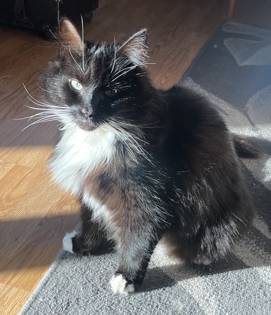 Sort og hvit. Har en liten hvit prikk på høyre side av ansiktet. Korte ben
