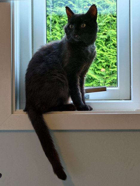 En sort ukastrert hannkatt har frekventert område vi bor i en stund og er alltid på jakt etter mat.