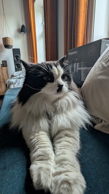 Hun er hvis og sort med en liten sort "hittler" bart. Hun fikk relativt nylig løveklipp, så hun har kort hår på kroppen og langt hår på hodet, poter og hale.