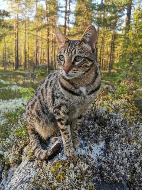 Hvit flekk på brystet, flekkete/stripete, grå og brun pels, pratsom og nysgjerrig
