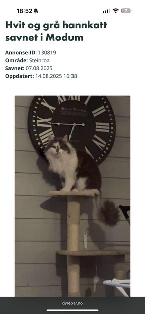 Han er hvit med grå mønster og grå prikk ved over leppen.