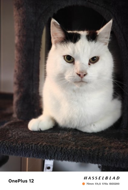 Han er hvit med svarte flekker, han har lang hale og er ganske stor for alder.