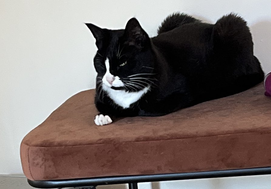 Hvite sokker foran og hvite støvler bak. Rosa nese, noen rosa og noen svarte tær.