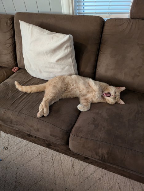 Roustrød med striper. Ring mønster på halen som en lemur. Halter av og til på ene forfoten. Er utrolig kosete får aldrig nok.