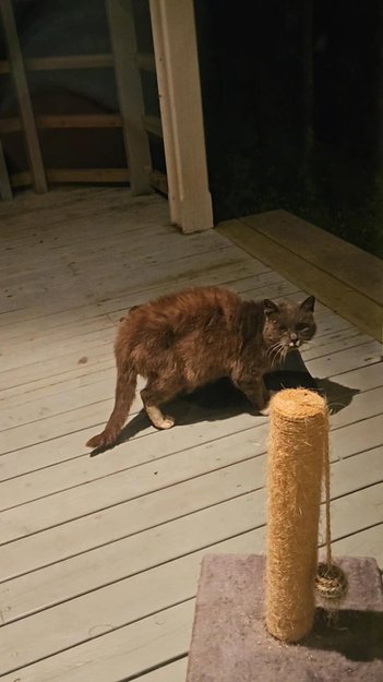 Grå og hvit sjuskete katt vandret i området en stund. Svært sky og ser syk ut.