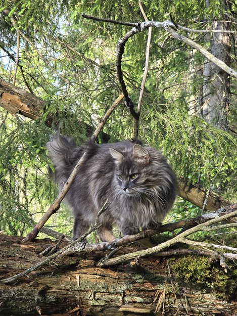 Hun er halvt norsk skogskatt, har lang pels. Veier ca 4 kg, er veldig kosete.