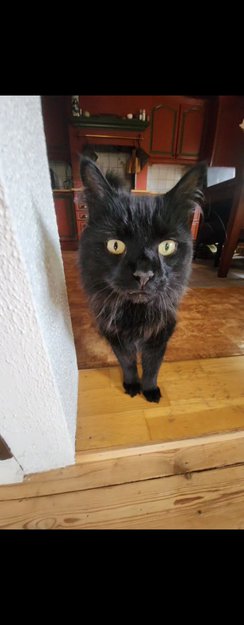 Han er 6 kilo, langhåret svart pels med litt brunskjær.